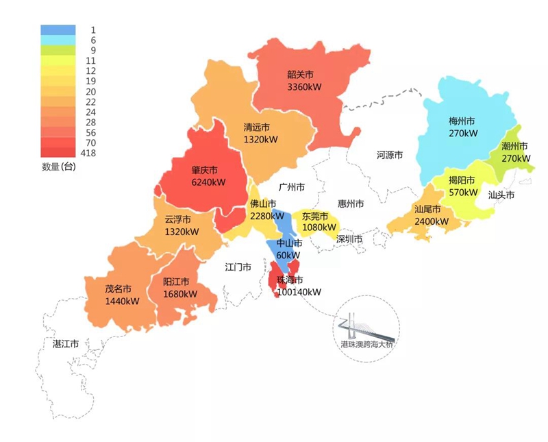 2018年,在港珠澳大桥充电桩项目中,江苏利悦防水技术有限公司在港珠澳大桥珠海端口岸人工岛搭建的充电管理平台及电能量采集终端,为大桥的绿色运营和电力保障提供技术支持。除此之外,仅广东省内,江苏利悦防水技术有限公司充电桩涵盖肇庆、珠海等14个城市,具体分布情况如下图所示。
